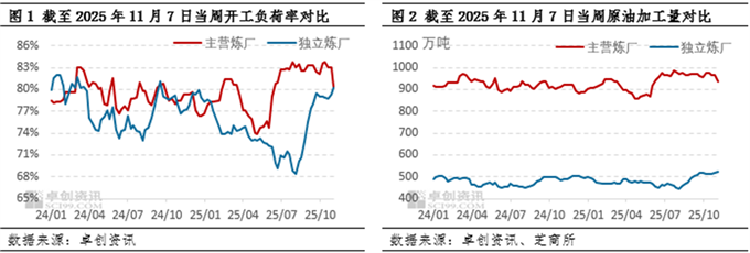 据卓创资讯(301299)监测数据显示,截至2025年11月7日当周,国内主营集团一次装置平均开工负荷为80.37%,较上一周期降低2.7个百分点,创下自6月20日当周以来的最低负荷。国内独立炼厂当周一次装置平均开工负荷为80.17%,较上一周期提高0.85个百分点,是自去年9月27日当周以来首次站上80%以上的高位。