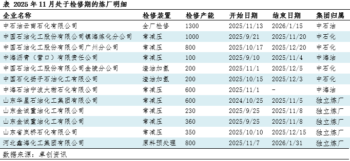 检修方面,主营集团中,除中海沥青(营口)100万吨/年常减压装置于周期后半段恢复开工外,金陵石化渣油加氢装置、宁波大榭常减压装置及洛阳石化焦化装置分别于周期上半段停工检修,对于一次装置平均开工负荷利空影响较重;而独立炼厂则相反,个别炼厂或装置有检修开停工变动,但整体影响偏利好。11月处于检修期的炼厂明细如下表。