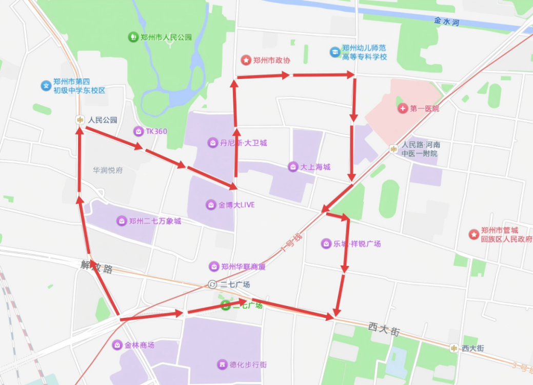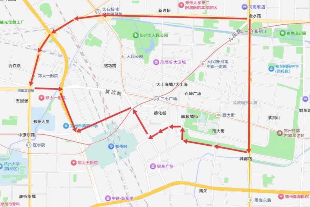 🔔外围分流:同一时段,视情况在更大外围区域【京广快速路(不含)、河医立交(不含)、金水路(不含)以东及以南,紫荆山路(不含)以西,城南路(不含)、南顺城街(不含)、大同路(不含)、福寿街(不含)、正兴街(不含)以北的合围区域】采取远端分流措施进行分流,引导车辆绕行。